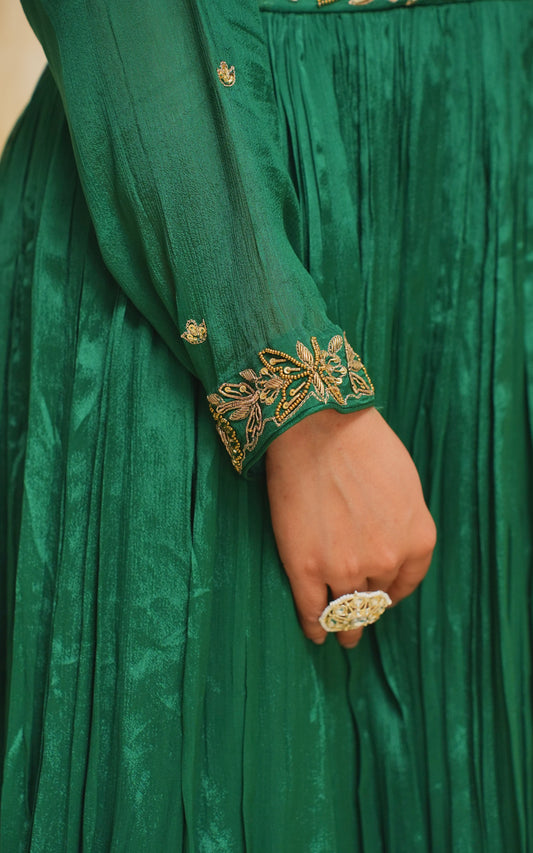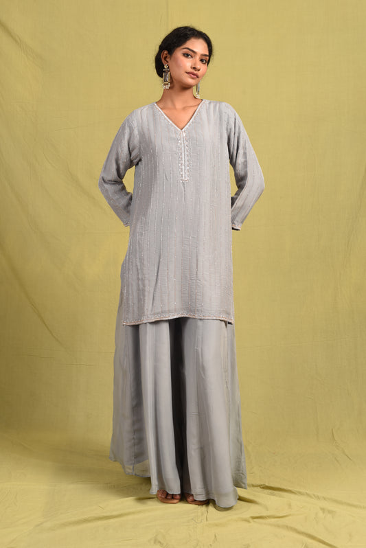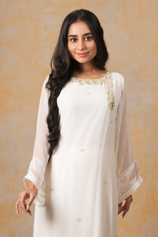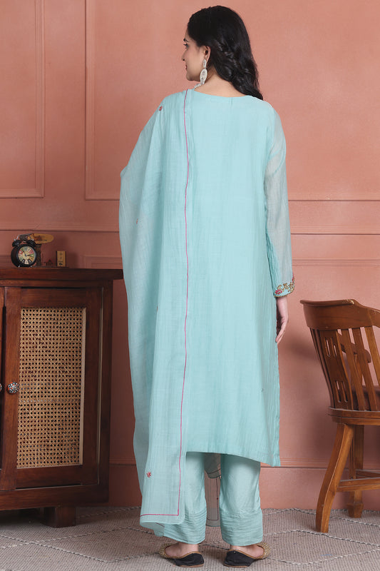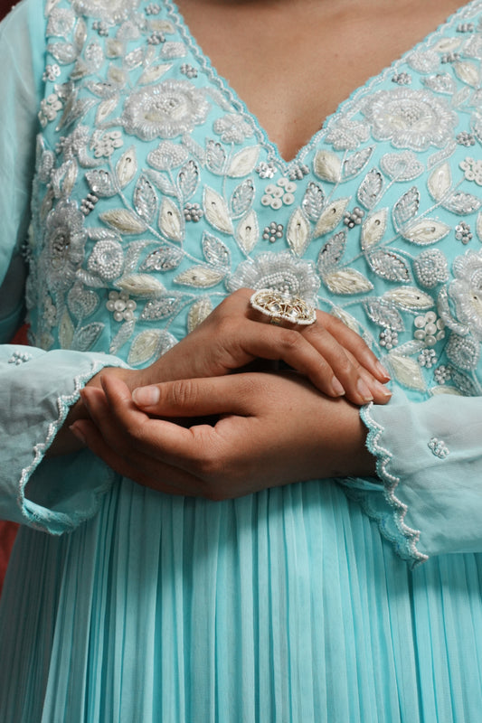Ira is an elegant piece crafted from pure chanderi fabric, adorned with intricate zardozi and resham work. Its soothing colour, summer breeze, adds a touch of serenity. Perfect for any occasion, elevate your style with Ira.
